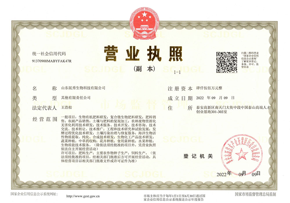 山東泥秀生物科技有限公司是泰安市政府通過(guò)招商引資引進(jìn)的企業(yè),地址:山東省泰安市高新區(qū)南天門(mén)大街中段泰山人才創(chuàng)業(yè)基地三樓,公司是一家集銷(xiāo)售新型肥料為主的高科技公司。公司全資子公司:棗莊泥秀生物科技有限公司為公司的生產(chǎn)基地,擁有國(guó)內(nèi)精湛的農(nóng)用微生物菌劑、生物有機(jī)肥、有機(jī)肥、有機(jī)無(wú)機(jī)復(fù)混肥、復(fù)合微生物菌肥等生產(chǎn)線(xiàn),年產(chǎn)能可達(dá)20萬(wàn)噸以上,是全國(guó)規(guī)模較大的生物有機(jī)肥生產(chǎn)基地。